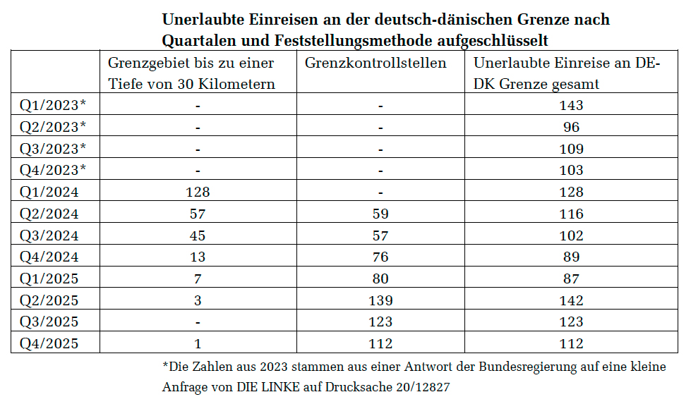 Die Zahlen sind eindeutig: Trotz eines grundlegenden Strategiewechsels im September 2024 weg von Ermittlungsarbeit im Hinterland und hin zu stationären Grenzkontrollen bleibt die Zahl der festgestellten unerlaubten Einreisen an der deutsch-dänischen Grenze in den Jahren 2023 bis 2025 konstant niedrig.